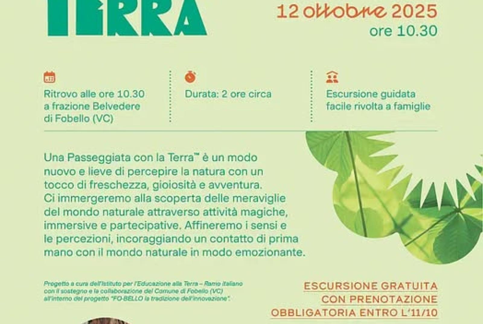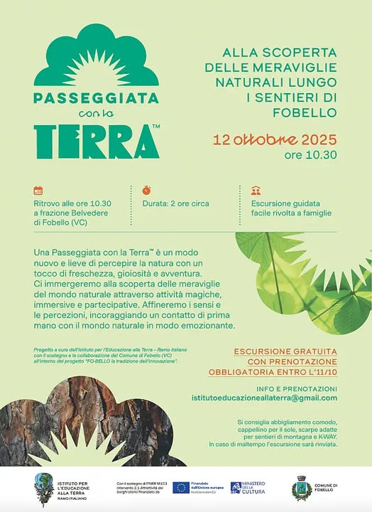 Il 12 ottobre alle ore 10.30 a Fobello verrà organizzata una "passeggiata con la terra", un nuovo modo di percepire la natura! L'attività si inserisce all'interno del progetto “FO-BELLO – la tradizione dell’innovazione, sostenuto dall’Unione Europea e dal Ministero della Cultura in collaborazione con il Comune di Fobello. Sarà un'escursione guidata della durata di 2 ore circa, rivolta a famiglie. L'escursione è gratuita con prenotazione obbligatoria.