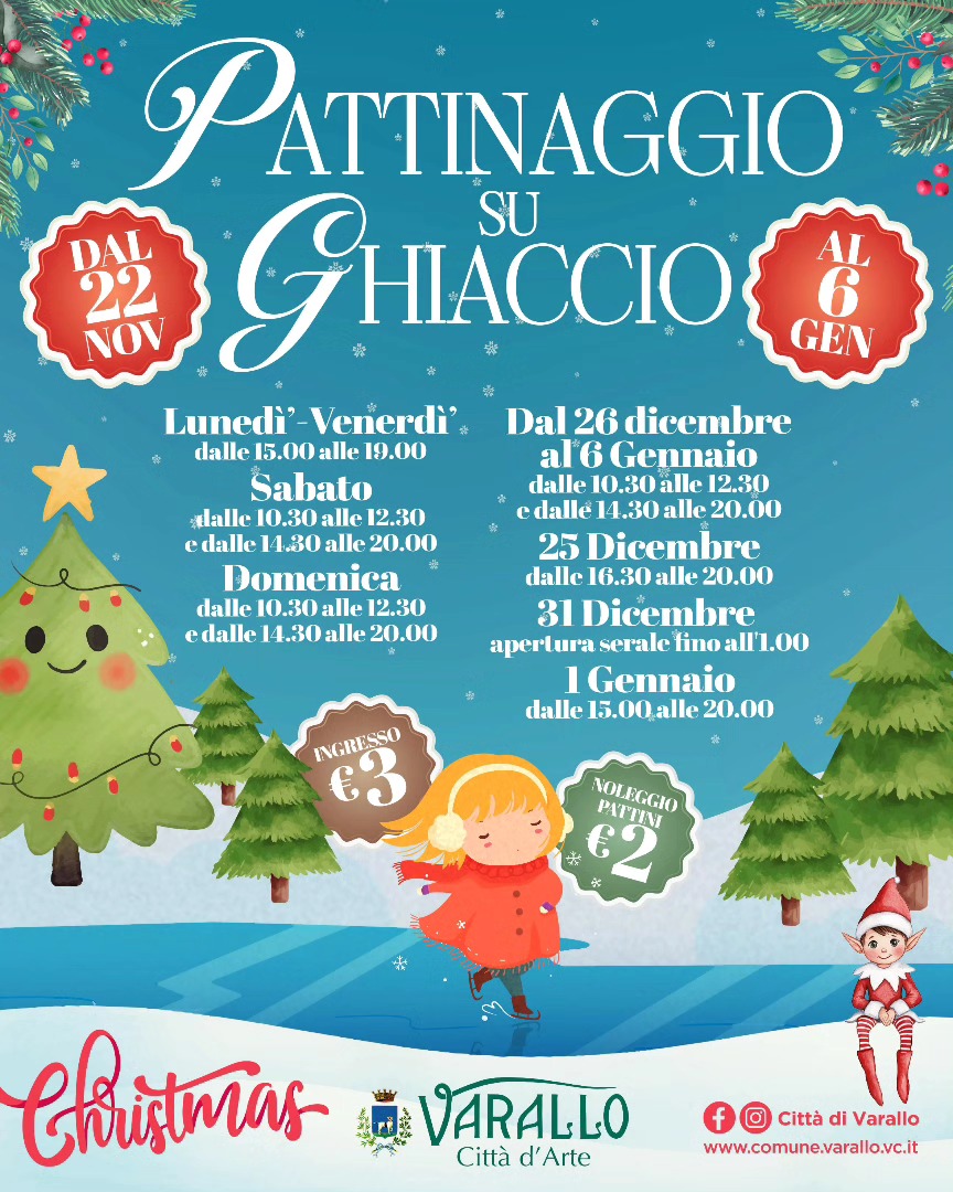 A Varallo dal 22 novembre al 6 gennaio sarà aperta la pista di pattinaggio in piazza Vittorio con i seguenti orari: lunedì - venerdì dalle 15.00 alle 19.00, sabato e domenica dalle 10.30 alle 12.30 e dalle 14.30 alle 20.00. Dal 26 dicembre al 6 agennaio dalle 10.30 alle 12.30 e dalle 14.30 alle 20.00, il 25 dicembre dalle 16.30 alle 20.00, il 31 dicembre apertura serale fino all'1 e il primo gennaio dalle 15.00 alle 20.00.