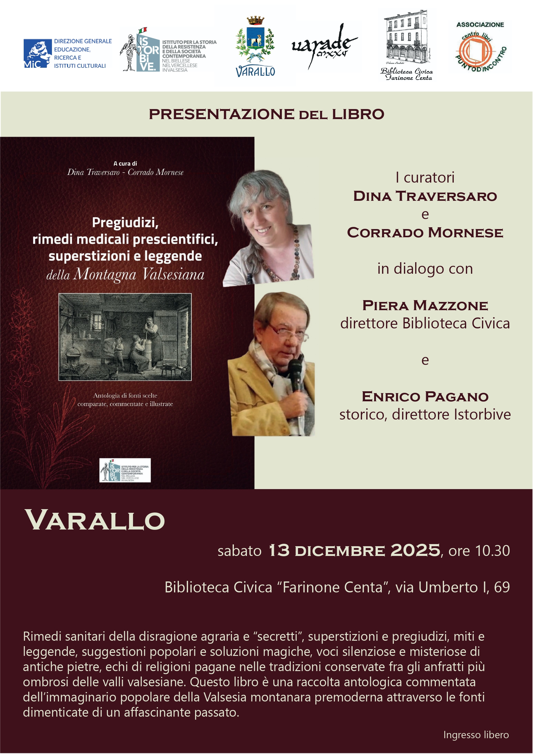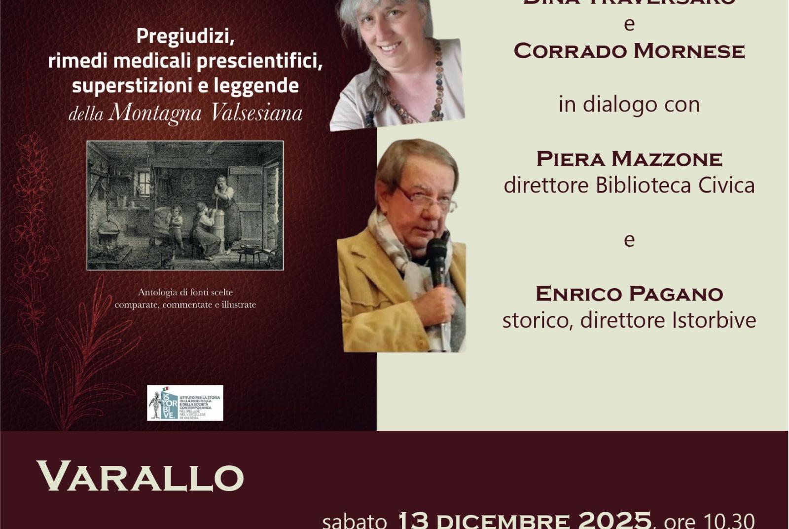 Sabato 13 dicembre 2025 a Varallo, presso la Biblioteca Civica “Farinone Centa”, alle ore 10.30, sarà presentato il volume a cura di Dina Traversaro e Corrado Mornese Pregiudizi, rimedi medicali prescientifici, superstizioni e leggende della montagna valsesiana. Antologia di fonti scelte comparate, commentate e illustrate. Durante l'incontro interverranno i curatori, in dialogo con Piera Mazzone, direttore della Biblioteca Civica, ed Enrico Pagano, direttore dell’Istorbive. Il volume è un’antologia che ripropone preziose quanto dimenticate fonti originali relative all’immaginario dei montanari valsesiani in epoca premoderna.