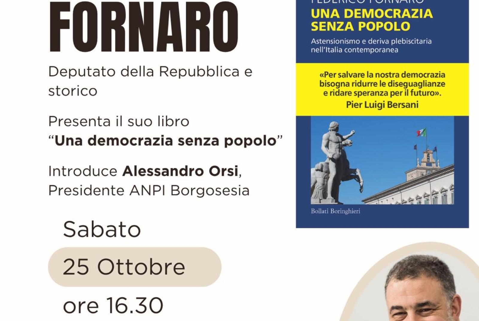 Sabato 25 ottobre 2025, a Borgosesia, al centro sociale di via Alberto Giordano 26, alle ore 16.30, sarà presentato il volume di Federico Fornaro Una democrazia senza popolo. Astensionismo e deriva plebiscitaria nell’Italia contemporanea. Sarà presente l’autore, che sarà introdotto da Alessandro Orsi, presidente della sezione Anpi di Borgosesia e consigliere dell’Istorbive. L’iniziativa è organizzata dall’Anpi di Borgosesia in collaborazione con l’Istorbive.
