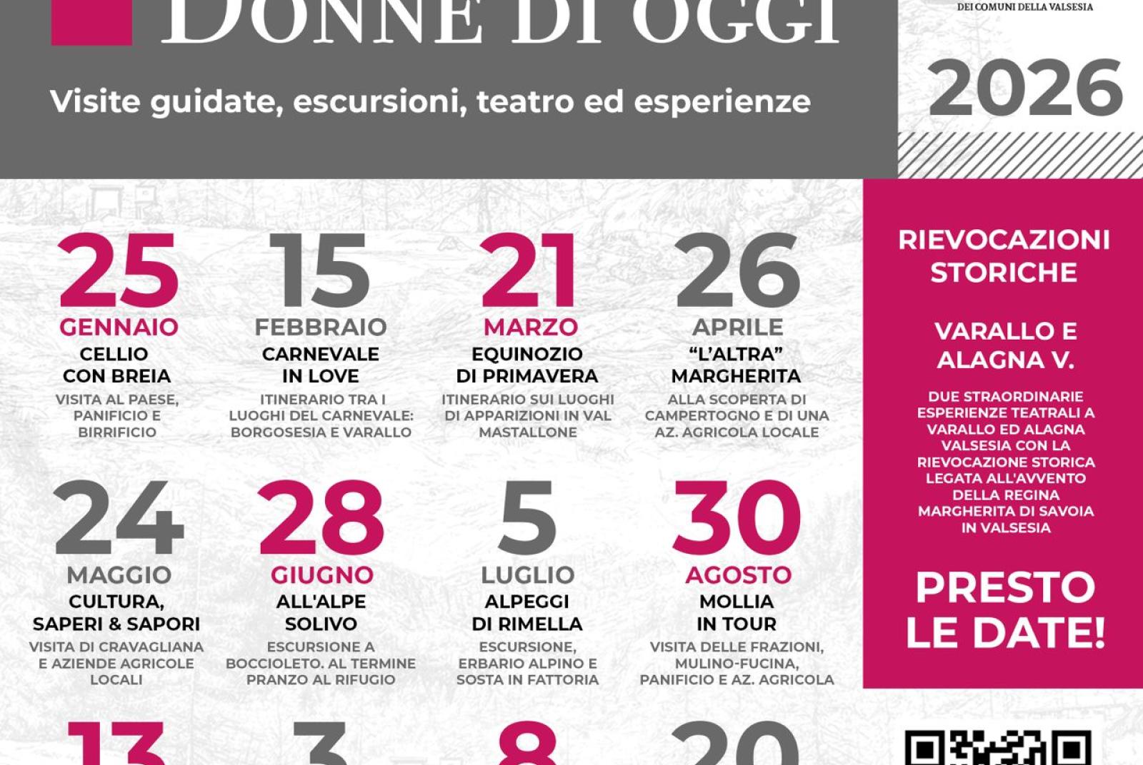 A 100 anni dalla scomparsa della Regina Margherita di Savoia sono stati organizzati 12 appuntamenti tra cultura, natura e relax per godersi la Valsesia con un team di guide abilitate donne. Il 01 febbraio tour guidato tra Fobello e Cervatto nella rinomata "Conca di Smeraldo" con le maschere del paese e la visita al biscottificio della strega. E' obbligatorio prenotare entro e non oltre 7 giorni prima della data del tour.