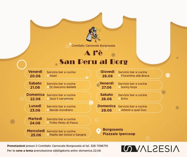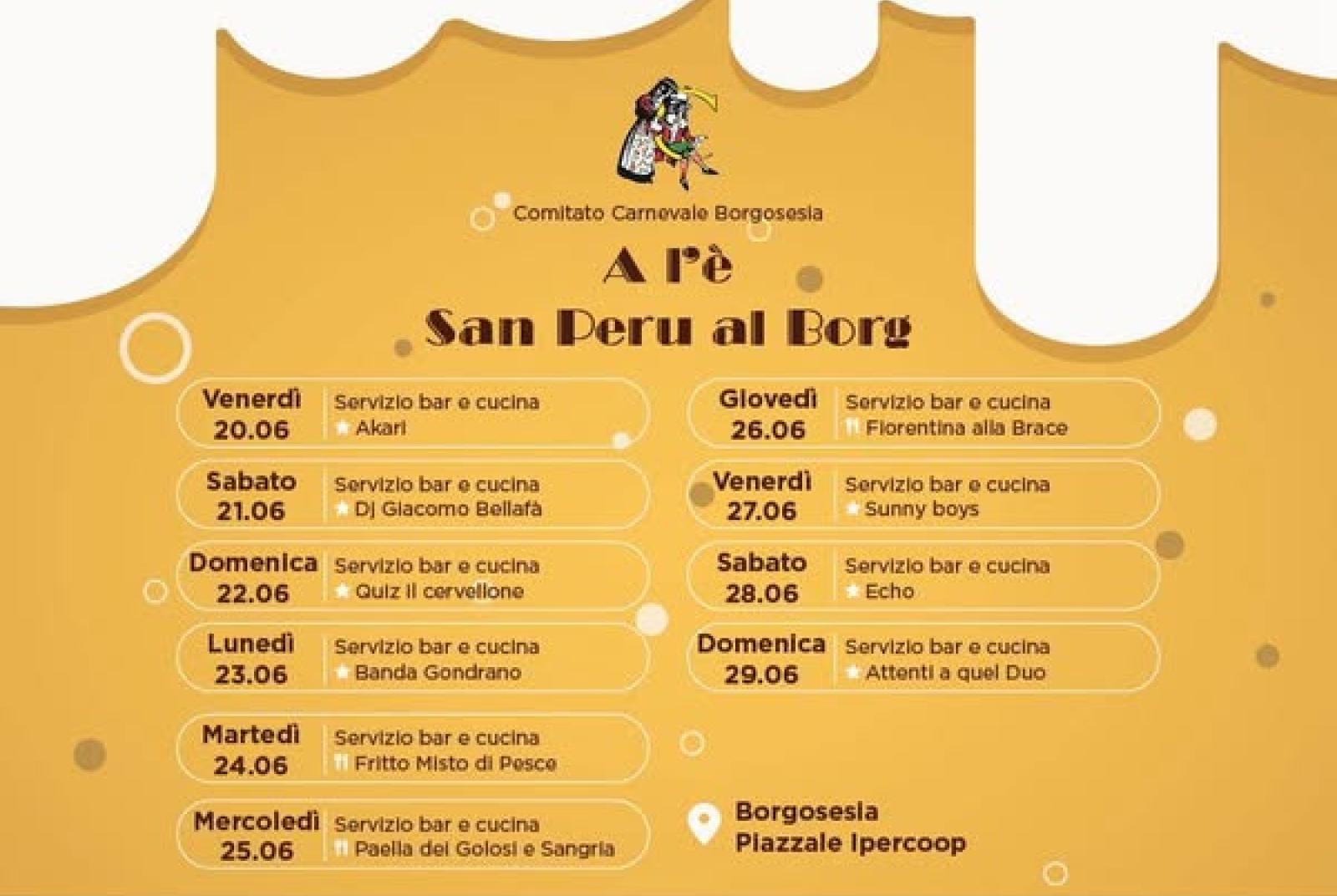 Torna finalmente A L'È SAN PERU AL BORG da VENERDÌ 20 GIUGNO a DOMENICA 29 GIUGNO presso il Piazzale Ipercoop di Borgosesia!Musica, birra, cibo, CENE A TEMA e tanto divertimento! È CONSIGLIATA la prenotazione al numero di telefono: 328 759 6719. Per le CENE a tema OBBLIGATORIA la prenotazione entro DOMENICA 22 GIUGNO.