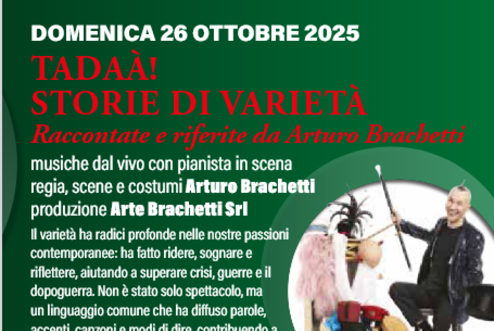 Domenica 26 ottobre presso la Pro Loco di Borgosesia si terrà Tadaà! Storie di varietà di Arturo Brachetti. Un nuovo progetto che debutterà in anteprima a Borgosesia, con musiche dal vivo e un pianista in scena che accompagnerà ogni storia con ritmo e colore. Regia, scene e costumi di Arturo Brachetti.