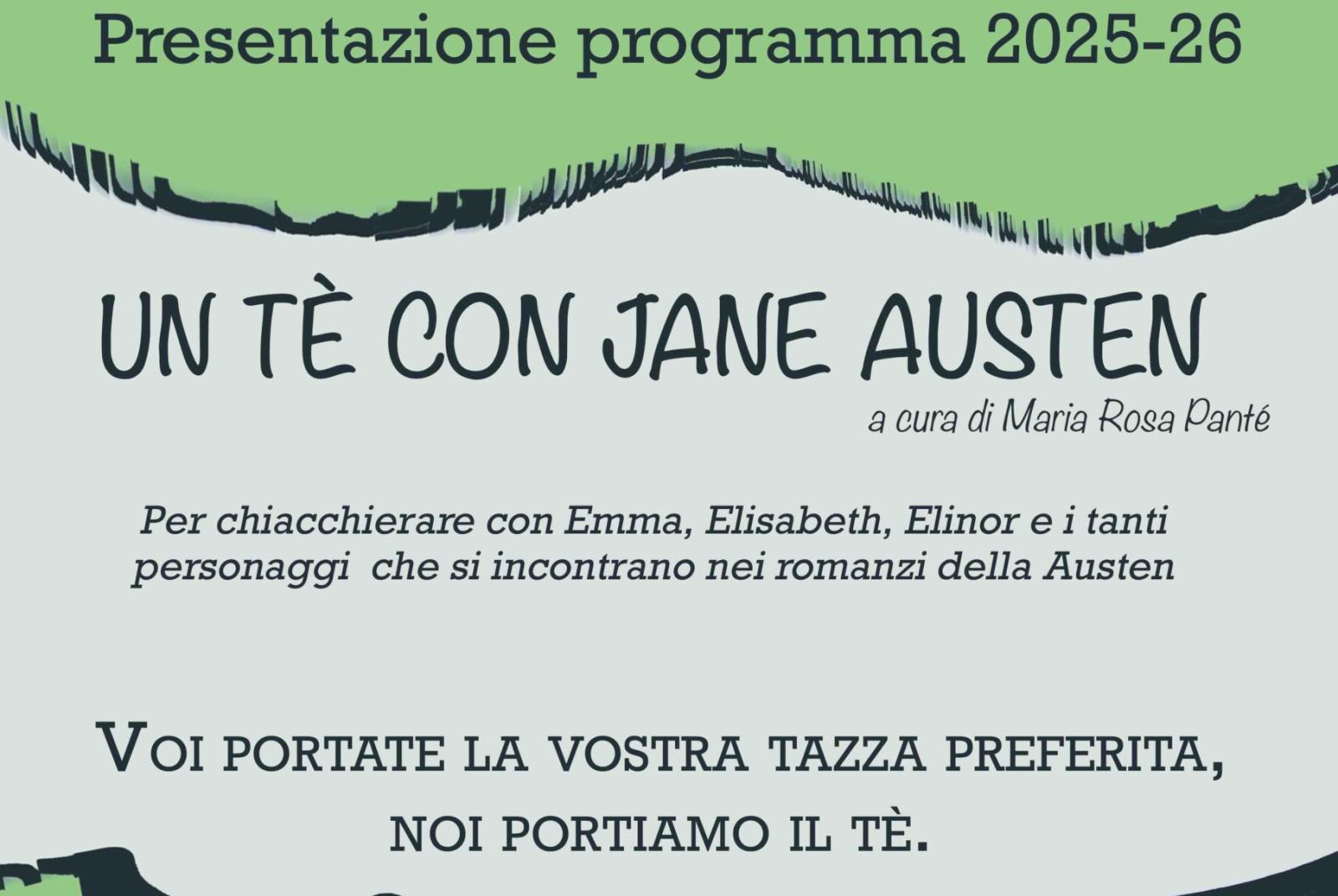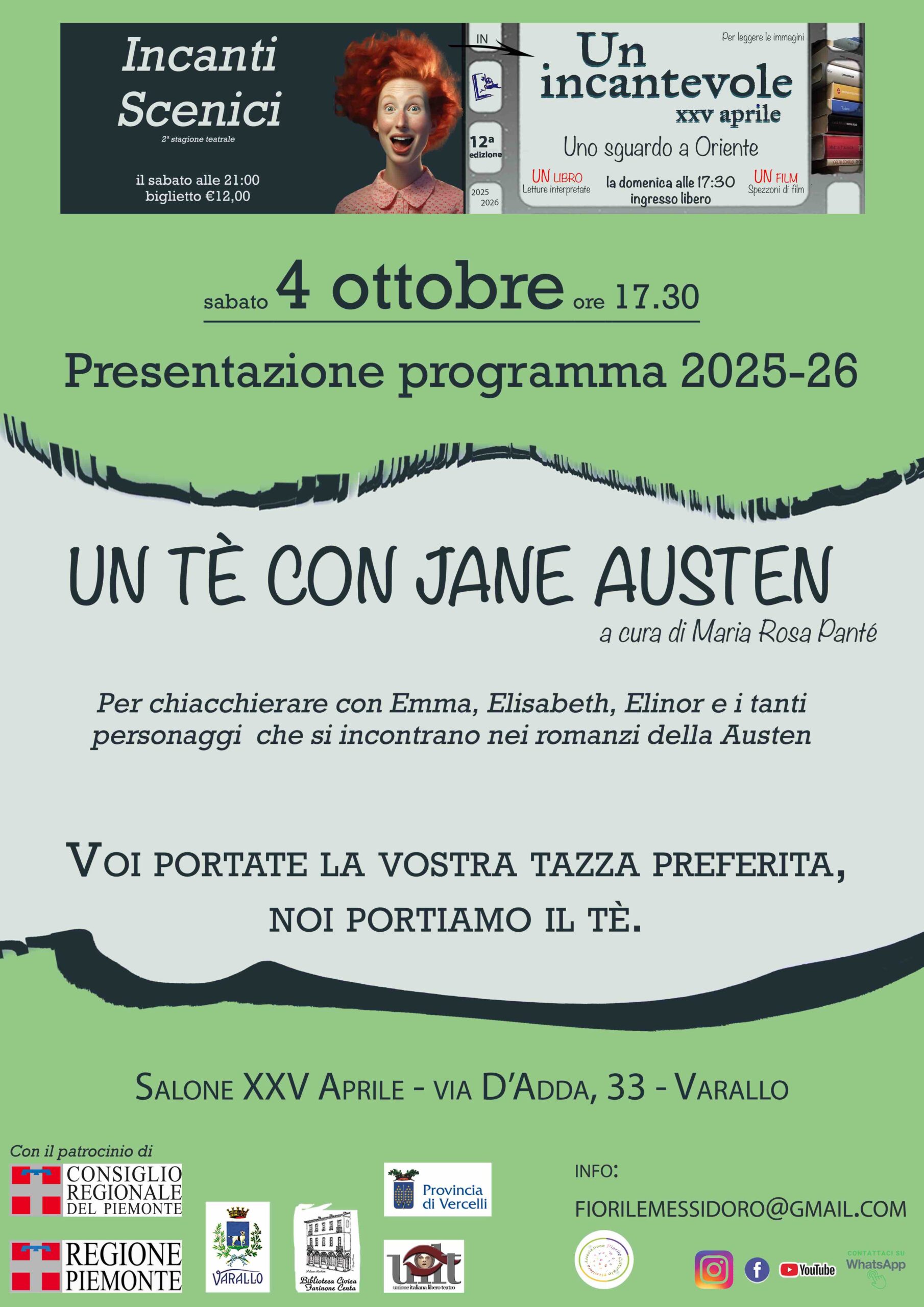 Sabato 4 ottobre alle ore 17.30- ingresso libero. Serata di presentazione del programma "Incanti Scenici in Un incantevole XXV Aprile" dal titolo Un tè con Jane Austen - si parlerà di Jane Austen, a cura di Maria Rosa Panté.