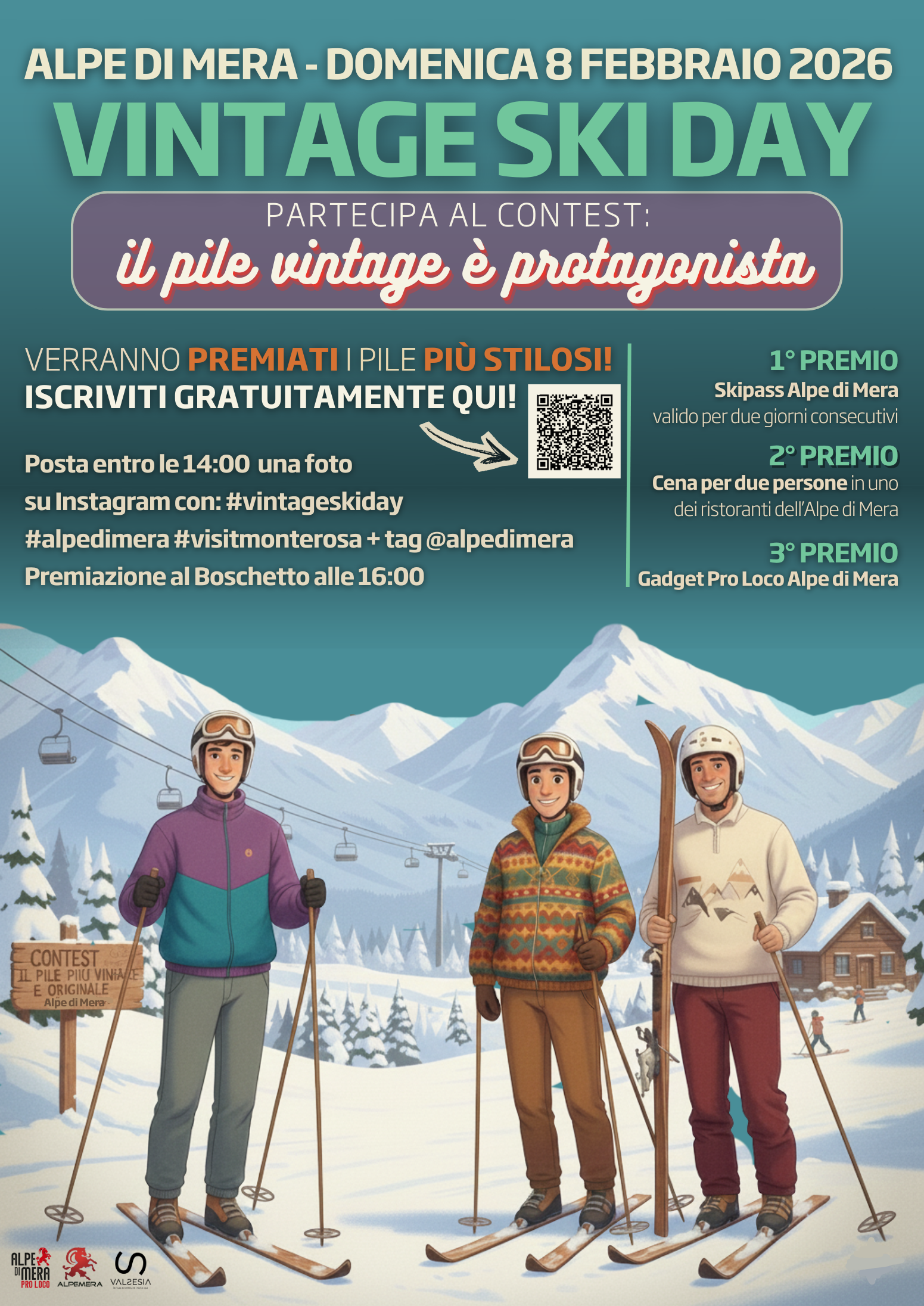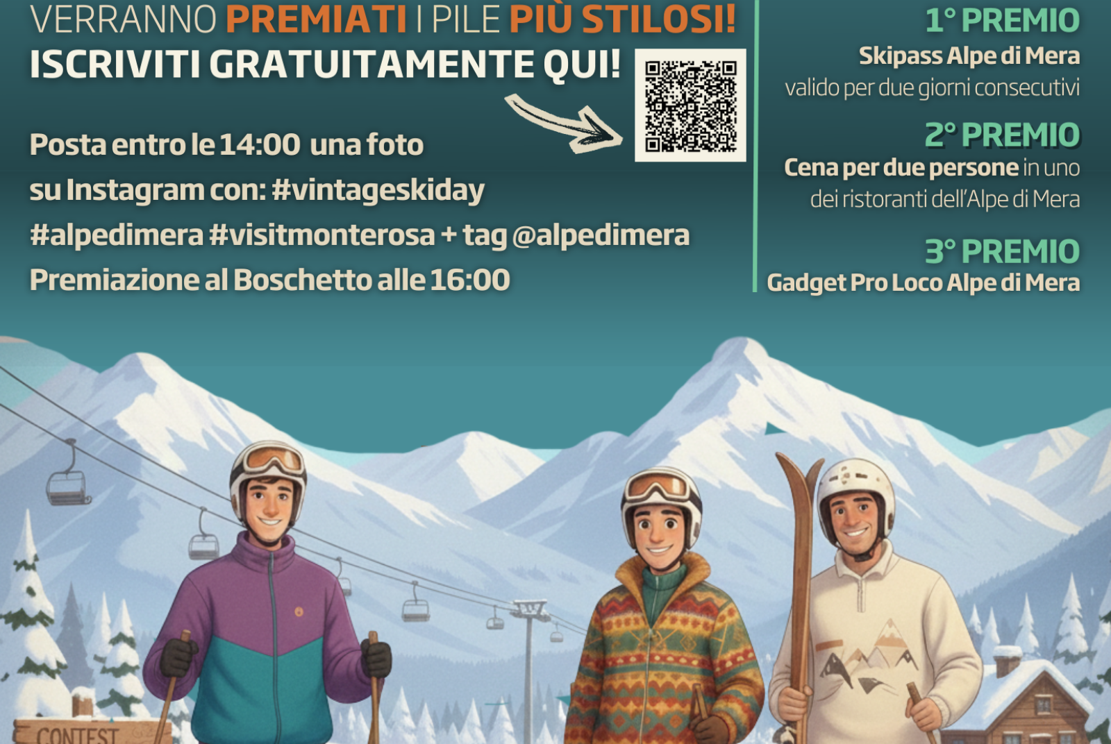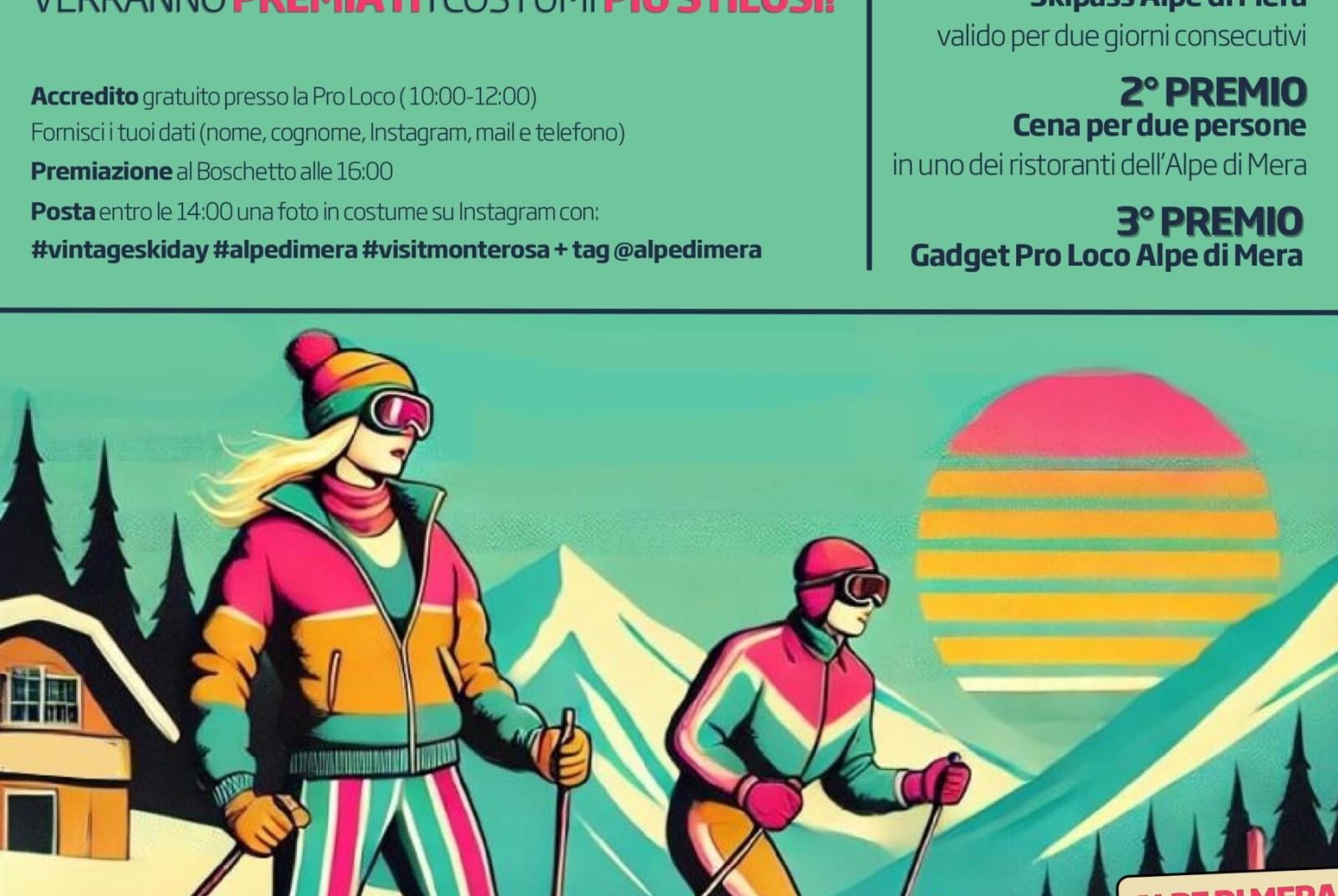 Verranno premiati i pile più stilosi! Posta entro le 14 una foto su IG con i tag: #vintageskiday #alpedimera #visitmonterosa + tag @visitmonterosa alle 16 premiazione al Boschetto! 1 premio skipass alpe di mera valido per due giori consecutivi, 2 premio cena per due persone in uno dei ristoranti di Mera 3 premio gadget pro Loco Mera.