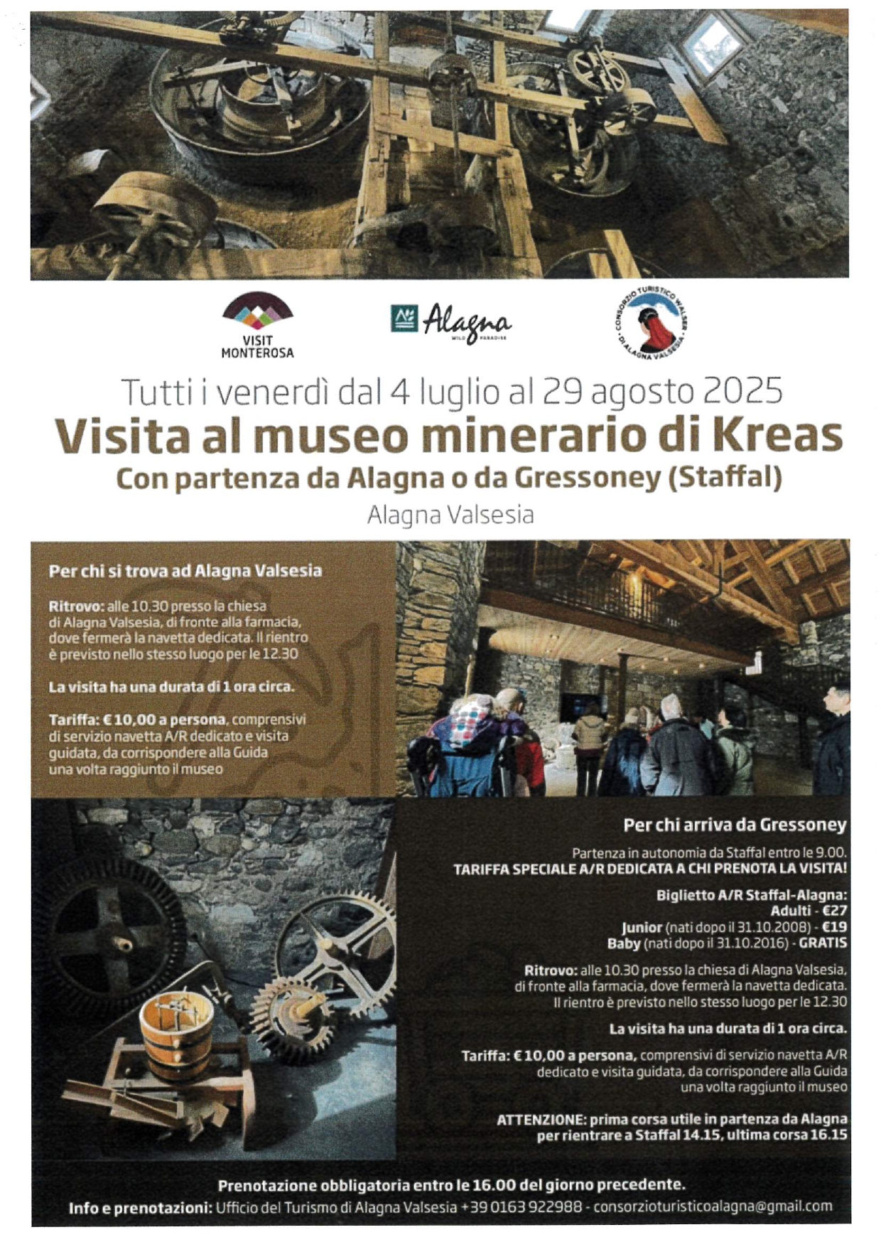 Tutti i venerdì a partire dal 04 luglio fino al 29 agosto si terranno le visite al Museo minerario di Kreas. Ritrovo alle 10.30 presso la Chiesa di Alagna di fronte alla farmacia. Il rientro è previsto nello stesso luogo per le 12.30 La visita ha durata di circa 1 h Prenotazione obbligatoria entro le 16 del giorno precedente.
