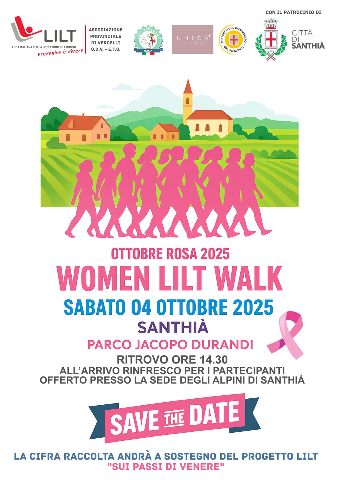 Sabato 4 ottobre alle 14.30 ritrovo al parco Jacopo Durandi a Santhià per una camminata solidale per sensibilizzare e sostenere la prevenzione dei tumori. All'arrivo rinfresco presso la sede Alpini di Santhià.