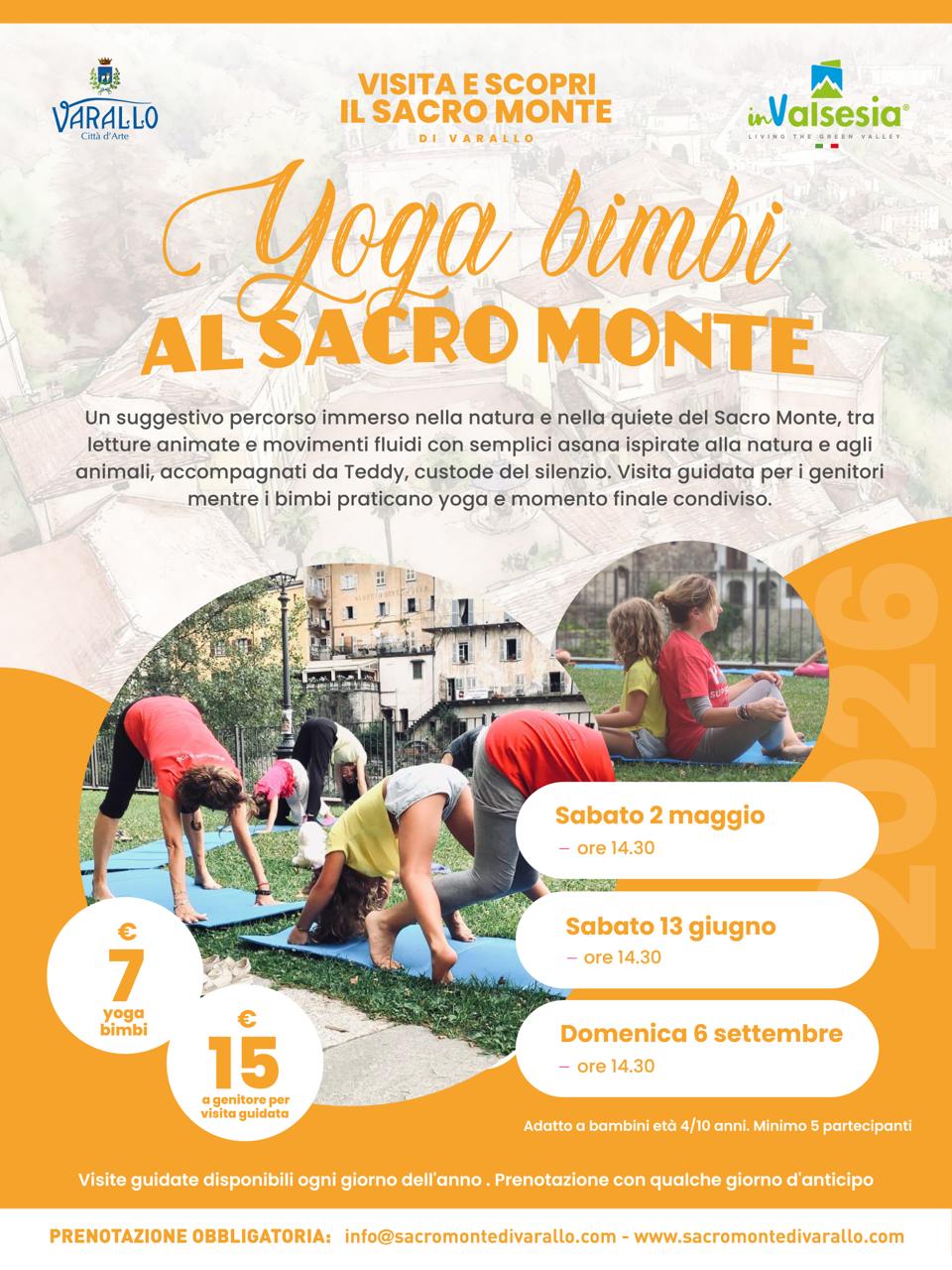 Sabato 2 maggio alle ore 14.30 presso il Sacro Monte di Varallo sarà organizzato una percorso di yoga per bambini e una visita guidata per i genitori mentre i bimbi praticano lo yoga. Adatto per bambini con età tra i 4 e i 10 anni. Minimo 5 partecipanti. Prenotazione con qualche giorno di anticipo rispetto alla data dell'evento